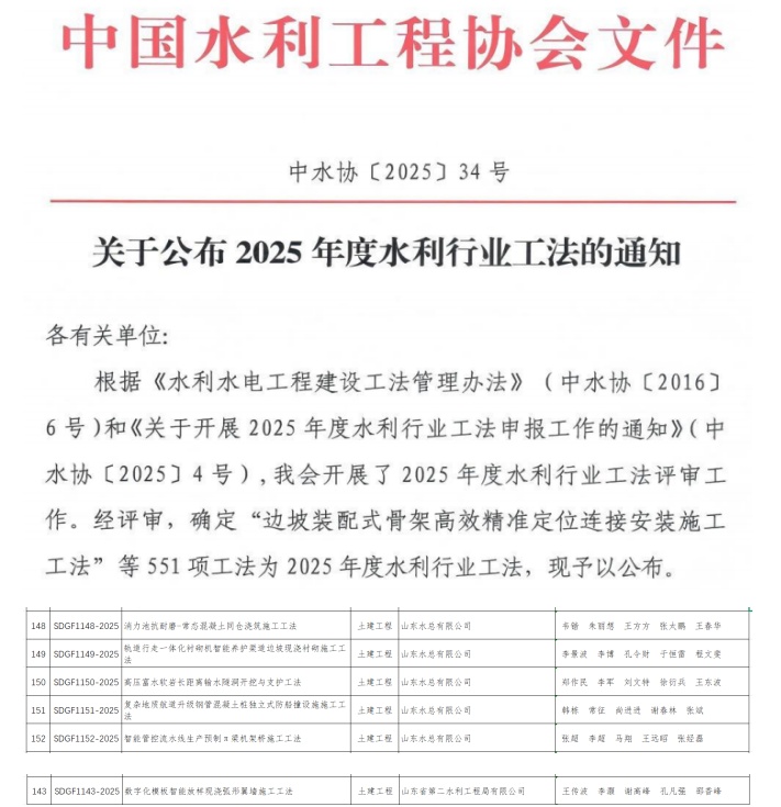 近日,中国水利工程协会正式公布2025年度水利行业工法评审结果,公司凭借在水利工程施工技术领域的持续创新与实践积累,共有6项工法成功获评,关键技术均达到国内先进水平。